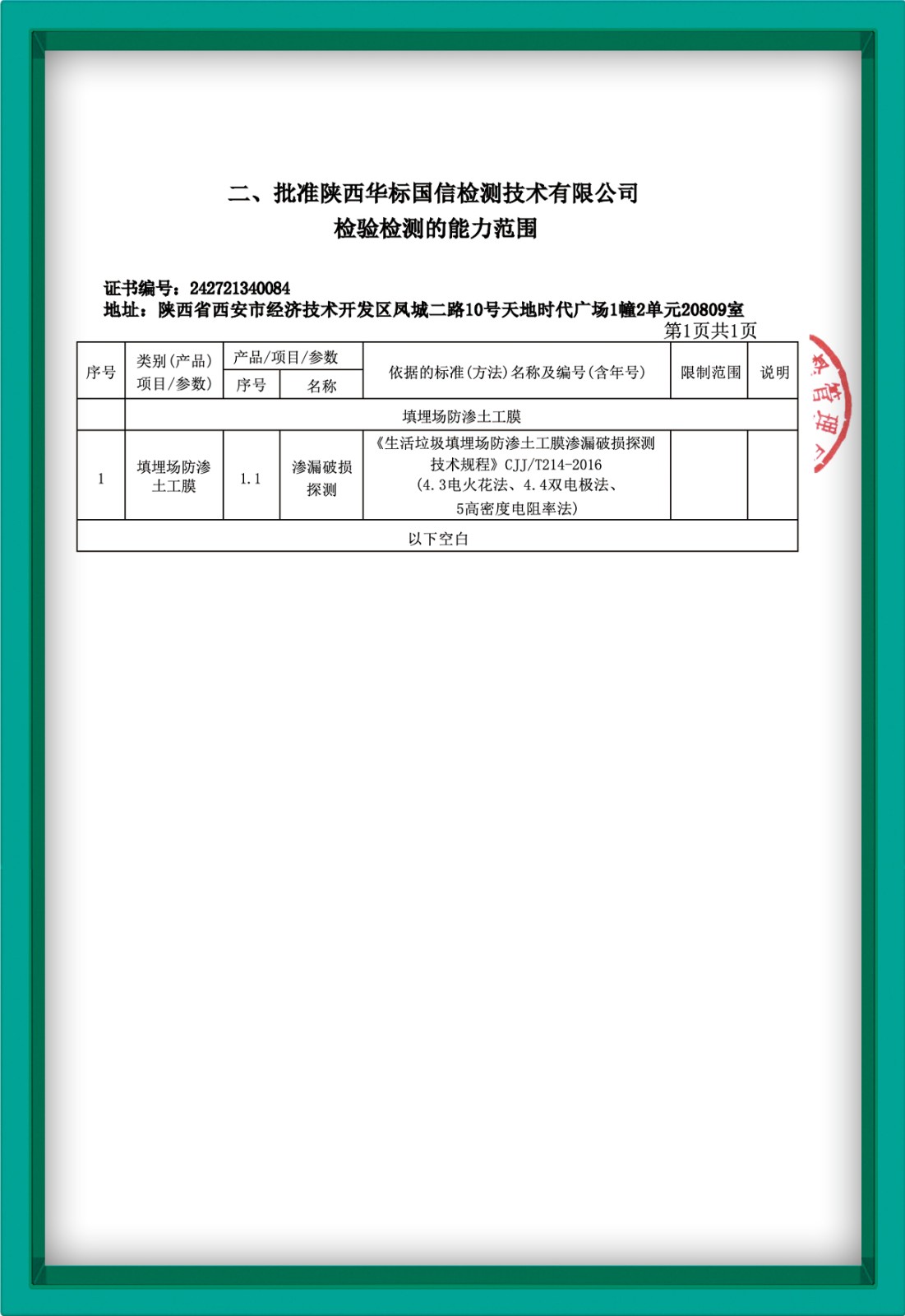 陕西华标国信检测技术有限公司具有市场监督管理局颁发的CMA检测资质,具备建设部颁发的《生活垃圾填埋场防渗土工膜渗漏破损探测技术规程》CJJ/T214-2016中要求的所有检测能力及检测方法。